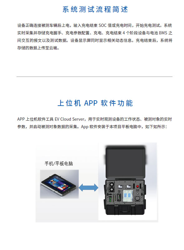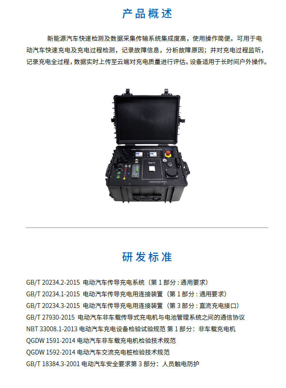 中盛新能新能源汽車快速檢測及數據采集傳輸系統(tǒng)集成度高,使用操作簡便。可用于電動汽車快速充電及充電過程檢測,記錄故障信息,分析故障原因;并對充電過程監(jiān)聽,記錄充電全過程,數據實時上傳至云端對充電質量進行評估。設備適用于長時間戶外操作。